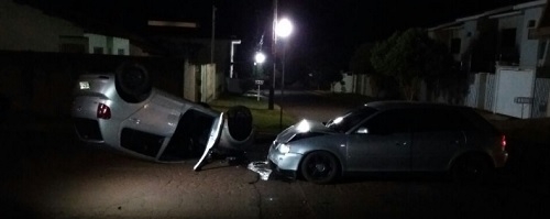 Teve carro capotado no perímetro urbano de Campo Mourão na noite desta terça-feira. Foi no cruzamento das ruas José Wierzchon e Saul Caldas, no jardim Albuquerque. Fox cruzou a rua e foi atingido por Audi. Com o impacto, o Fox ficou de rodas para cima. Apesar do impacto e do susto, ninguém se feriu. O acidente aconteceu perto da casa de três vereadores - Edilson Martins, Elvira Schen e Professor Cícero.
