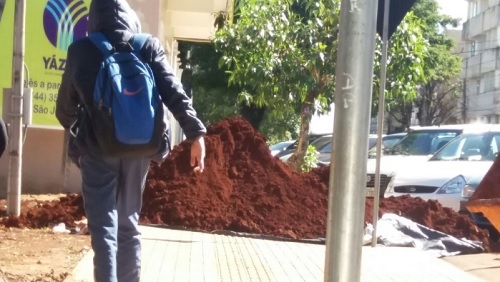 Monte de terra sobre a calçada impede a passagem de pedestres. Flagra desta segunda-feira, na rua Roberto Brzezinsski, próximo à av. Capitão Índio Bandeira.
