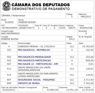 O deputado federal Rubens Bueno publica todo mês, em seu site oficial, o holerite da Câmara dos Deputados. Esse aí é o de maio. O subsídio total foi de R$ 33,7 mil, mas com descontos o que sobra dá R$ 21,4 mil. Entre os descontos tem R$ 7,3 mil de Imposto de Renda e R$ 3,7 mil de Previdência.