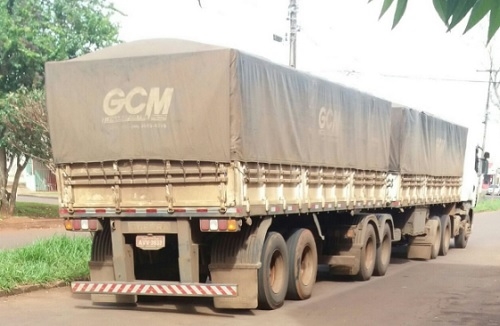Carretona bitrem passa pela av. Goioerê, centro de Campo Mourão. O flagra é desta sexta-feira, por volta do meio-dia, em frente a uma escola. Isso bem na hora da saída dos alunos, ou seja, de trânsito intenso no local.