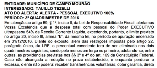 O Tribunal de Contas do Estado publicou nesta sexta-feira o alerta para a prefeitura de Campo MOurão por gasto com pessoal.