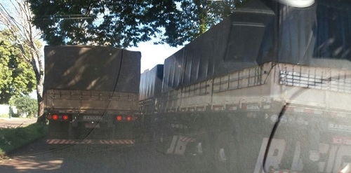 Cena de um caminhão fazendo ultrapassagem sobre outro numa rodovia, certo? Errado. A cena é da av. Guilherme de Paula Xavier, perímetro central de Campo Mourão.