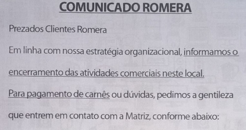 Trecho do comunicado do fechamento das Lojas Romera em Campo Mourão.