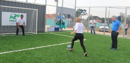 A prefeitura de Farol inaugurou neste sábado a arena multiuso esportiva construída em parceria com o governo do Estado. O secretário Douglas Fabrício (Esporte e Turismo) participou. A inauguração fez parte da programação do Dia do Agricultor. Mesmo de salto, a prefeita Angela Kraus deu seu chute a gol, com o vice-prefeito Natal Saraiva de goleiro. E aí, foi gol ou não foi?...