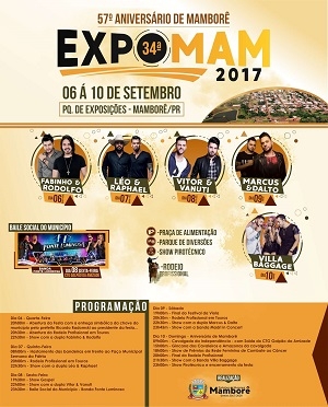 A prefeitura de Mamborê divulgou nesta quarta-feira a programação da 34ª Expomam.
