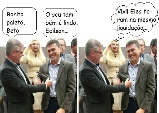 Os cliques são de terça-feira, quando a Câmara de Campo Mourão fez sessão solene para entrega de Mérito Desporito a Luciano Jorge Holler. E não é que o vice-prefeito Beto Voidelo e o vereador Edilson Martins apareceram com um peletó igualzinho? E tudo observado pela vereadora Nelita Piacentini. Ai-aiai-aiai!...