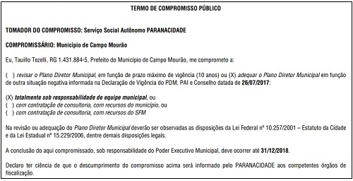 "Declaro ter ciência de que o descumprimento do compromisso acima será informado pelo ParanaCidade aos competentes órgãos de fiscalização", frisa um trecho do documento. A adequação do Plano Diretor é uma da exigência para sair, de fato, o dinheiro.