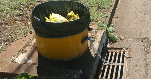Na av. João Bento, no centro de Campo Mourão, corrente prende latão de lixo na grade do bueiro. O objetivo seria evitar o roubo do latão ou da grade?...