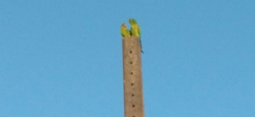 "Casal de maritacas sobre poste de energia, no final de tarde desta segunda-feira, no conjunto Capricórnio". Irineu Ricardo