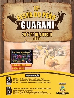 Mamborê - A prefeitura realiza neste sábado e domingo a 16ª Festa do Peão da comunidade do Guarani. O evento contará com rodeio profissional em touros, cavalgada, apresentações culturais, show com a banda New Sound e festival da viola, entre outras atrações.