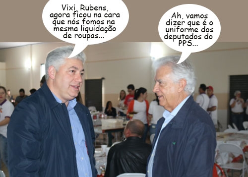 O clic é de domingo, em Peabiru, durante a Festa do Carneiro ao Vinho. O secretário de Estado Douglas Fabrício (Esporte e Turismo) e o deputado federal Rubens Bueno, ambos do PPS, se encontraram por lá e aproveitaram para colocar a conversa em dia. Estavam com camisas e blusas praticamente iguais. Ah, o PPS prega o "socialismo", não prega?...