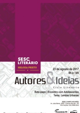 Bate-papo literário - A escritora Heloísa Prieto estará em Campo Mourão no próximo dia 23. Vem participar do ciclo literário "Autores & Ideias" promovido pelo Sesc. Com o tema "Lendas urbanas", ela participará de dois bate-papos com adolescentes, às 9h e às 14h.