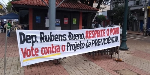 Sindicatos e movimentos sociais fizeram nesta quinta-feira mais uma mobilização em Campo Mourão contra o projeto de reforma da Previdência. Foi no calçadão. Teve panfletagem, faixas e sistema de som. Uma das faixas era dirigida ao ex-prefeito Rubens Bueno, hoje deputado federal. "Respeito o povo. Vote contra o projeto da Previdência", destava. Bueno, no entanto, já deixou claro que é favorável à proposta do presidente Michel Temer. Em todo caso, quem não chora...