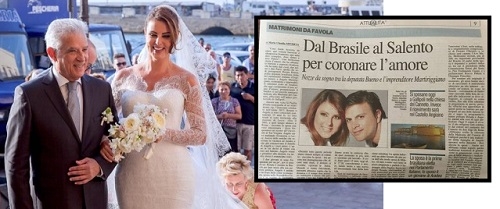 "Sem legenda, nossos sorrisos dizem tudo!" A frase está em postagem no Facebook da deputada ítalo-mourãoense Renata Bueno. Ela se casou nesta sexta-feira, em Lecce (Itália), com o empresário Angelo Martiriggiano. Na foto, a noiva é levada pelo pai, o deputado federal e ex-prefeito de Campo Mourão, Rubens Bueno. No destaque, a notícia do "casamento dos sonhos" publicada por jornal italiano. "A noiva é a primeira brasileira no parlamento italiano", destaca o jornal.