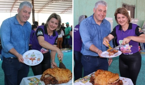 Olha a prefeita de Farol, Angela Kraus, ajudando a servir o secretário de Estado Douglas Fabrício (Esporte e Turismo) na 13ª Festa do Pernil à Pururuca, realizada neste domingo em Farol. Mais de 3,5 mil pessoas almoçaram o prato típico do município. Entre eles o deputado federal Zeca Dirceu e nove prefeitos da região. A festa só terminou no finalzinho da tarde, com show da dupla Bruno & Barreto.