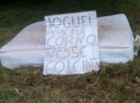 Quando a gente acha que já viu de tudo em Campo Mourão, olha o que apareceu num terreno perto do conjunto Verdes Campos, na região do Cidade Nova. O colchão foi jogado fora junto com uma placa explicativa. "Joguei, pois fui corno nesse colchão". Se alguém quiser levar para casa, chifre não pega assim, pega?... Foto: Jean