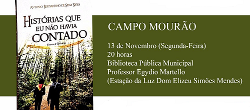 O ex-prefeito de Goioerê, Antonio Sena, vai lançar em Campo Mourão, no prõximo dia 13 (20h). Será na Biblioteca Municipal. “Histórias que eu não havia contado” é uma coletânea de contos e crônicas, com 216 páginas. O livro é dedicado ao ex-deputado Darcy Deitos, de Campo Mourão, que morreu em 2013. Os dois se conhecderam na década de 1970, como militantes do MDB, que fazia oposição ao governo da ditadura militar.