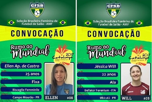 A Confederação de Futebol de Salão do Brasil divulgou nesta terça-feira a relação das jogadoras convocadas para o Mundial Feminino,que será realizado de 18 a 25 deste mês na Catalunha (a divulgação não fala em Espanha, só em Catalunha). Entre as convocadas estão Ellen, de 25 anos, que é de Campo Mourão, e Jéssica Will, de 22, que é de Ubiratã. As duas jogam em times italianos. O Brasil está no grupo de Suíça e Taiwan.