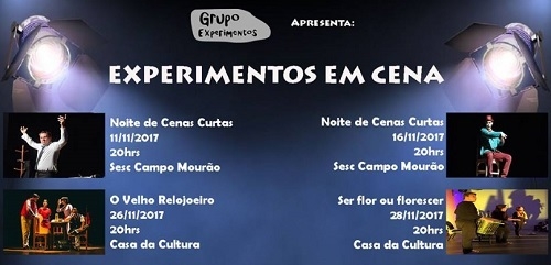 O Grupo Experimentos de Teatro está completando cinco anos e para comemorar marcou quatro apresentações para este mês. A primeira será neste sábado (20h), no Sesc, com a "Noite de Cenas Curtas", que também será apresentada dia 16. No dia 26 haverá a reestreia do espetáculo "O Velho Relojoeiro". Já no dia 28 estreia "Ser flor ou florescer". Os ingressos estão disponíveis na Casa da Cultura e com os membros do grupo.
