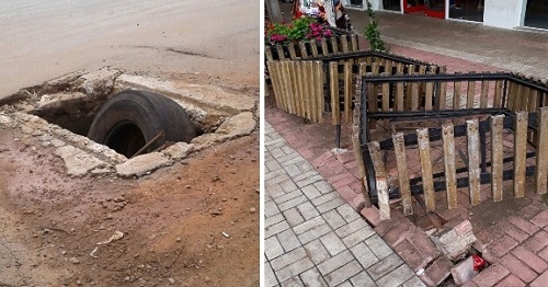 1) Bueiro sem grade segue sinalizado com pneu velho. Fica na rua Cruzeiro do Oeste, fundos do posto Andrade.