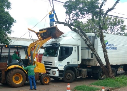 No capítulo anterior você viu que a carreta ficou enroscada numa árvore da da av. Guilherme de Paula Xavier e tentou-se usa outra carreta para o "desenrosco". Não deu certo e se apelou, então, para um trator pá-carregadeira e a mãozinha de operários.