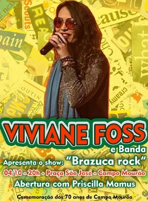 Começou no fim de semana a programação cultural pelos 70 anos de Campo Mourão. Todo dia tem show na praça São José às 20h. Nesta quarta-feira será a "noite do rock". Viviane Foss e Banda farão o show "Brazuca Rock". Na quinta tem apresentação com os professores e alunos do Conservatório Municipal. Na sexta será avez de Show Gospel com o grupo Terno e Saia e o gaúcho gospel Cancioneiro de Cristo. E por aí vai até o dia 10, dia no aniversário do município.