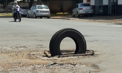 "Assim está sinalizada uma boca de lobo nos fundos do Posto Andrade, início da av. Guilherme de Paula Xavier. Quanto tempo será que teremos que esperar por uma providência?"