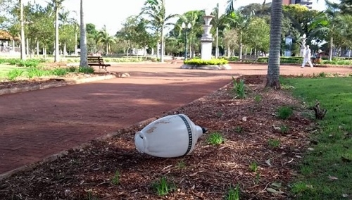 Globo de poste republicano da praça Getúlio Vargas, no centro de Campo Mourão, aparece "na chón".