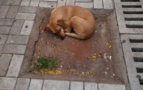 Espaço destinado ao plantio de árvore, no calçadão de Campo Mourão, vira "cama" para cachorro de rua.