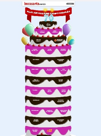 Campo Mourão completou 70 anos e, como manda a tradição, teve bolo da Boca Santa para comemorar. O bolo foi retirado do ar na tarde desta segunda-feira. Portanto, se ele continua aparecendo para você, talvez seja hora de fazer uma limpeza nos arquivos de navegação.