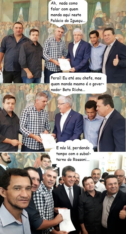 Os cliques são desta quarta-feira, quando quatro vereadores de Campo Mourão aproveitaram solenidade no Palácio Iguaçu para entregar pedidos ao chefe da Casa Civil, Valdir Rossoni, e ao govermador Beto Richa. Teve de heliporto na Santa Casa a sistema de monitoramento externo em escolas estaduais. O deputado Márcio Nunes e o secretário Douglas Fabrício acompanharam os vereadores Tucano, Miguel Ribeiro, Edilson Martins e Cabo Cruz.