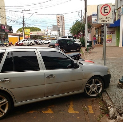 Rua Mato Grosso, centro de Campo Mourão, por volta das 13h de sexta-feira. A placa e a sinalização horizontal dispensam comentários.