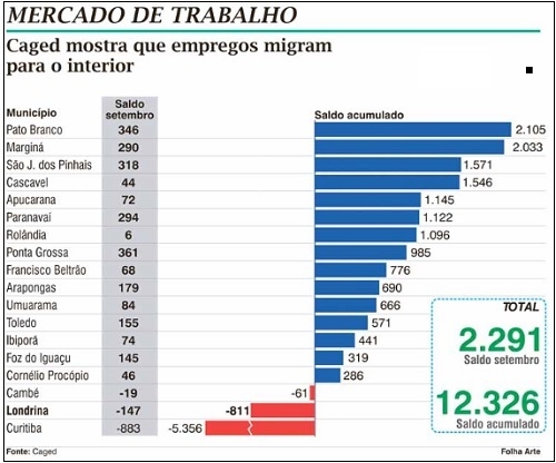Matéria da Folha de Londrina, nesta terça-feira, mostra os números do Caged do Paraná e conclui que os empregos migraram para o interior. Destaca Pato Branco, Francisco Beltrão, Toledo, Arapongas, Umuarama e Paranavaí, entre outros, mas nada de Campo Mourão. Pudera. Segundo o Caged, a "terra do carneiro no buraco" ficou com saldo negativo de empregos em setembro (-27), nos primeiros nove meses deste ano (-35) e nos últimos 12 meses (-179). Eita! Sai, zica!...