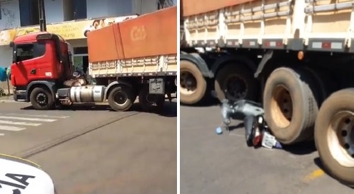 Carreta bitrem entra na av. Capitão Índio Bandeira, via rua Santos Dumont, e acaba se envolvendo em acidente com uma moto. Por sorte, a condutora da moto não se feriu. Fotos: Dione Correia/Hora Certa