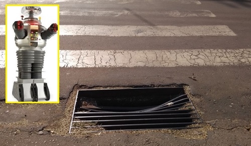 "Meus sensores indicam que é preciso tomar cuidado na hora de atravessar a av. Irmãos Pereira, esquina com rua Harrison José Borges. O bueiro fica na direção da faixa de pedestre e a grade está toda danificada, com um buraco sufidente para caber o pé de muita gente". O alerta é do Robô de "Perdidos no Espaço", que está de volta à Boca Santa.