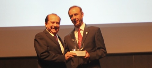Caco Alzugaray, presidente executivo da Editora Três, ao entregar ao presidente da Coamo, José Aroldo Gallassini, o prêmio de "Melhor Cooperativa Agropecuária" no País, conforme ranking da mova edição "As Melhores da Dinheiro", da revista IstoÉ Dinheiro; quinta-feira, em São Paulo.