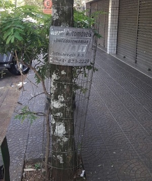 Grade de proteção do início dos anos 90 ainda resiste em pleno 2017. A árvore também. É do tempo que o prefixo de telefone de Campo Mourão era "823". Fica na rua Harrison José Borges, centro.