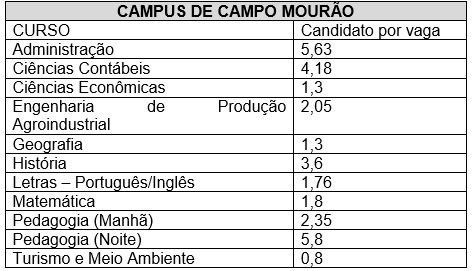Pedagogia noturno superou adminstração é o curso mais concorrido no vestibular da Unespar, que será realizado dia 15 de novembro. Isso entre os cursos do câmpus de Campo Mourão. São 5,8 candidatos por vaga em pedagogia e 5,6 em adminstração. Ciências contábeis, com 4,18, completa o pódio. A menor disputa será no curso de turismo e meio ambiente - 0,8 candidato por vaga. Isso quer dizer que tem mais vaga que inscritos. Confira os demais cursos no quadro acima.