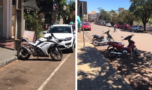 "Algum dia será que vamos ver motos estacionadas em vagas de motos? Neste caso (rua Harrison José Borges), a vaga para moto fica a 20 metros e com sombra (foto à dir.), mas preferem estacionar no sol e “tirar” uma vaga so para ele".