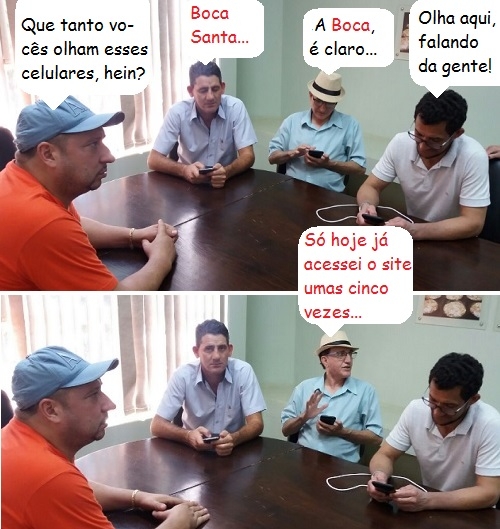 O clic é de sexta-feira, quando vereadores estiveram reunidos na prefeitura com o prefeito Tauillo Tezelli. Enquanto a reunião nçao começava, todo mundo de olho no celular - Jadir Pepita, Olivino Custódio e Cabo Cruz. Só Tucano Ribeiro que não. Justo ele que tem comércio de celulares...