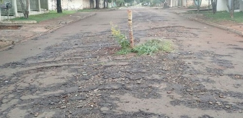 "Imagem da Rua Vereador Carlos Stalman, entre o jardim Bandeirantes e o conjunto Piacentini, em Campo Mourão. A "plantação" é recente, mas as "condições do asfalto" são bem antigas. Tomara que essa árvore faça sombra logo, pois esperar pelo recape asfáltico no sol tá difícil!"