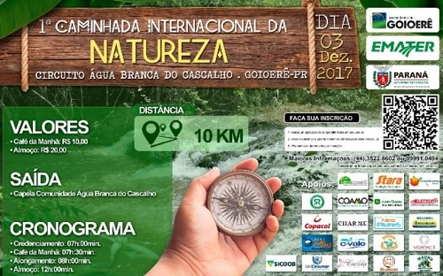 Chegou a vez de Goioerê realizar sua 1ª Caminhada Internacional na Natureza. Será o circuito Água Branca do Cascalho, com 10 km entre trilhas e estradas rurais. A saída será da comunidade Água Branca do Cascalho, às 8h. É possível se inscrever no local, a partir das 7h. A promoção é da prefeitura e da Emater. A participação é gratuita, mas para quem quiser haverá café da manhã (R$ 10) e almoço (R$ 20).