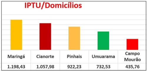 Em entrevista coletiva sobre as mudanças no Código Tributário, nesta quinta-feira, o secretário Beto Pequito (Fazenda), apresentou quadros para mostrar que o IPTU de Campo Mourão está mais barato que em outras cidades do Estado. O quadro acima mostra o valor médio do imposto por casa. Outro quadro comparou a receita do imposto per capita. Ou pelo valor do metro quadrado em terrenos do centro, com Campo Mourão ficando com menos da metade de Paranavaí - R$ 750 a R$ 303,68.