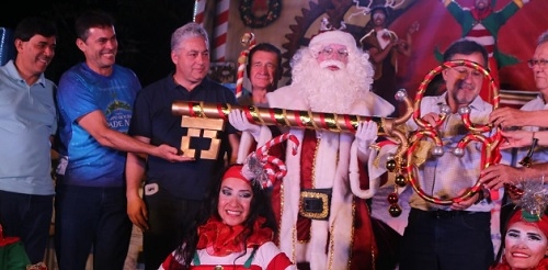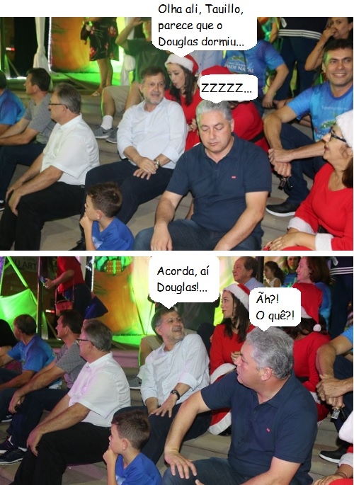 A chegada do Papai Noel a Campo Mourão, neste sábado, fez parte de um espetáculo produzido pela Associação Sou Arte. Os políticos presentes acompanharam sentados nas escadas da praça São José, como o prefeito Tauillo Tezelli, o secretário de Estado Douglas Fabrício, o vice-prefeito Beto Voidelo e o presidente da Câmara, Edson Battilani.