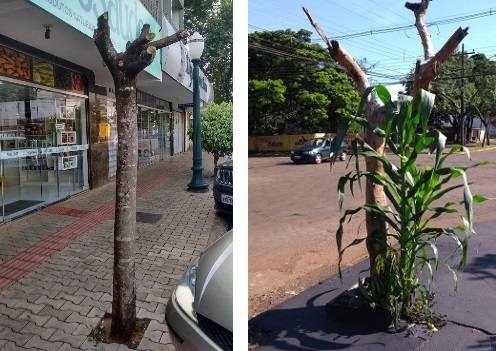 1) Em pleno verão, quando a gente precisa de sombra, olha a poda drástica dessa árvore na rua São Paulo, b em no centro da cidade.