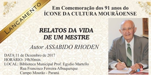 O professor Assabido Rhoden vai lançar na próxima segunda-feira seu quarto livro: "Relatos da vida de um mestre". Será às 19h30, na Biblioteca Municipal. O lançamento faz parte das comemorações pelos 91 anos de idade do professor. Assabido mora na região há mais de 40 anos e se aposentou como professor da Unespar, onde autou por 21 anos. É membro das academias mourãoenses de Letras e de Filosofia.