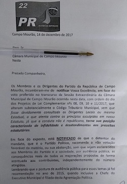 Pouco antes da sessão desta sexta-feira dois vereadores do PR recebeream ofício pedindo voto contrário aos projetos.
