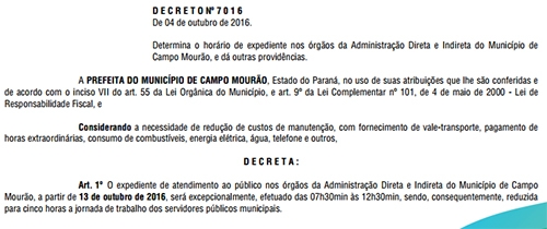A partir do dia 13 a prefeitura de Campo Mourão só vai funcionar das 7h30 às 12h30.