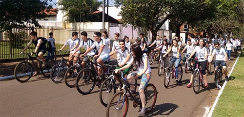 Passeio ciclístico em plena sexta-feira útil em Campo Mourão? Sim, por que não? Foi o que fizeram cerca de 200 alunos e professores do Colégio Sesi. Parte estava a pé e também havia alguns com skates e patins. A atividade fez parte de um trabalho sobre sustentabilidade. O objetivo foi mostrar que, muitas vezes, não é preciso usar carro. A pesseata misturada com passeio ciclístico percorreu parte do centro de Campo Mourão.