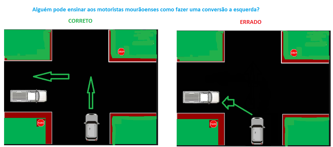 Incomodado com as barberagens de parte dos motoristas de Campo Mourão, internauta envia instrução para ser publicada na Boca Santa. “Alguém pode ensinar os motoristas mourãoenses como fazer uma conversão à esquerda?”, pergunta ele no quadro acima. Em tempo: a figura à esquerda é o jeito certo e, à direita, o jeito errado...